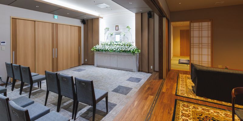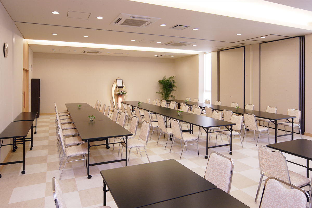| 1F告別式場 | 120名収容 | 1F通夜室(和室) | 40名収容 |